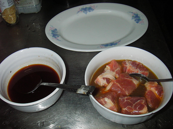 1. 將梅花肉塊切成適當大小然後醃漬半小時